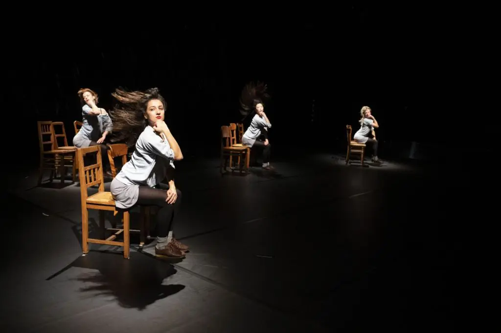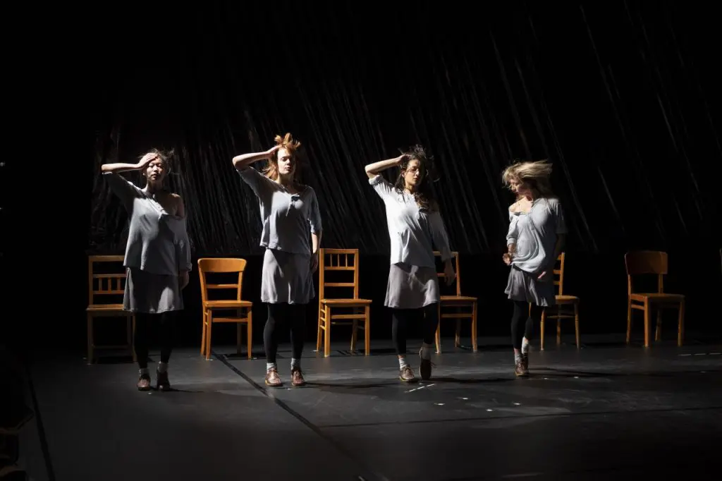 Sur scène, quatre danseuses “se dansent elles-mêmes” sans relâche et redéfinissent le mouvement en alternant délicatesse et fougue. Sidérantes, débordantes d’énergie et de fragilité, elles subliment les petits gestes du quotidien. D’une part des mouvements abstraits, de l’autre, des mouvements plus concrets, reconnaissables : la main qui lisse les cheveux, qui rectifie la tenue d’une blouse, la tête qui tourne brusquement… La danse comme la musique, imaginée par Thierry de Mey et Peter Vermeersch et composée durant le processus chorégraphique, s’appuient sur des boucles répétitives et minimalistes.